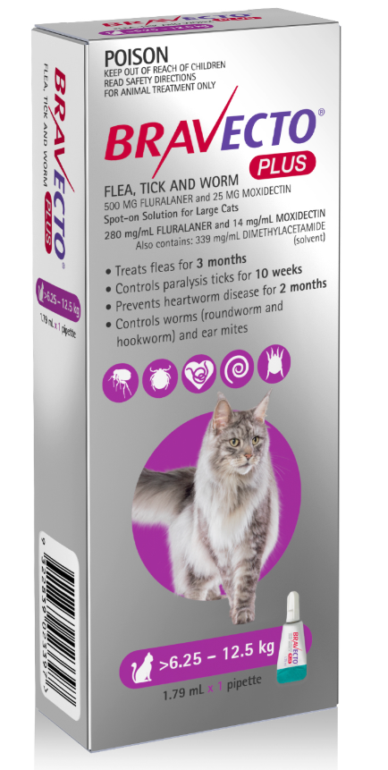 Bravecto Spot On provides medium-sized cats with reliable protection against fleas and paralysis ticks in an easy-to-use topical treatment. One dose offers 3 months of flea and tick protection, quickly killing fleas within 12 hours and paralysis ticks within 48 hours.