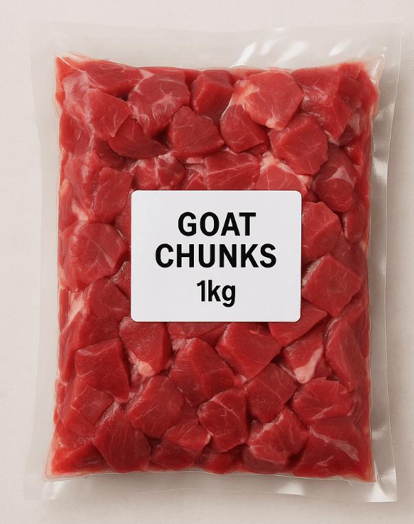 🐐 100% Goat Meat: Premium cuts of goat, diced into chunks for easy portioning and chewing