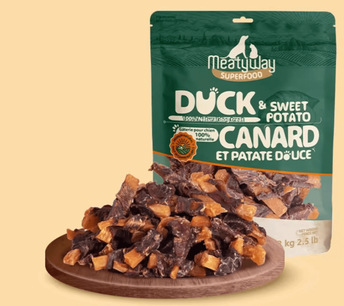 MeatyWay Duck & Sweet Potato Dog Treats are a flavourful, protein-rich snack crafted with real duck breast and nutrient-dense sweet potato. Gently air-dried to retain natural goodness, this treat is ideal for dogs with poultry sensitivities or grain allergies.