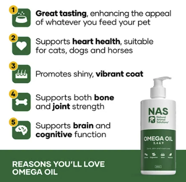 ✨ Coats & Skin – Promotes shiny coat, reduces dry, itchy skin, and neutralizes skin odor
