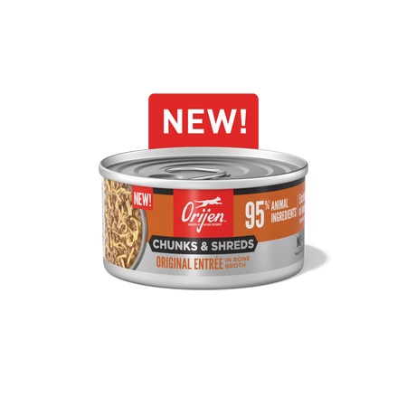 ORIJEN™ Chunks & Shreds – Original Entrée is a high-protein, grain-free wet cat food crafted with real chicken, turkey, and wild-caught fish, providing a biologically appropriate diet inspired by your cat’s natural needs.