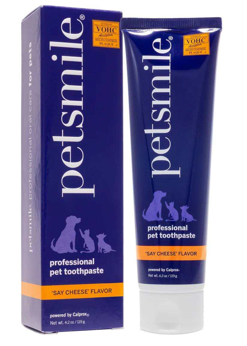 The Petsmile Professional Pet Toothpaste – Say Cheese is the only pet toothpaste approved by the Veterinary Oral Health Council (VOHC) for dogs and cats. Designed to promote oral hygiene and fresh breath, this toothpaste uses safe, effective ingredients to reduce plaque and tartar while being completely safe for pets to swallow.