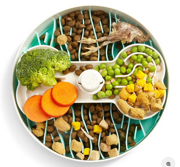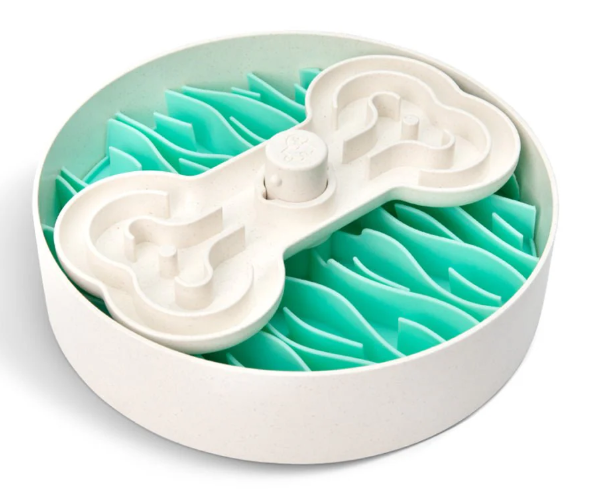• Features modular design with three parts: the main bowl base, a spinning bone plate, and the “Broken Wave” slowing mat. Allows for different feeding modes to match your dog’s progress or eating habits.