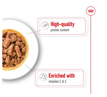 This recipe supports optimal digestion with highly digestible proteins and a precise fibre blend. It helps maintain ideal weight and supports a healthy skin and coat, thanks to an exclusive complex of nutrients including omega-3 fatty acids. The tender chunks in gravy are highly palatable, making it an excellent choice for picky eaters or as a complement to Royal Canin Medium Adult dry food.